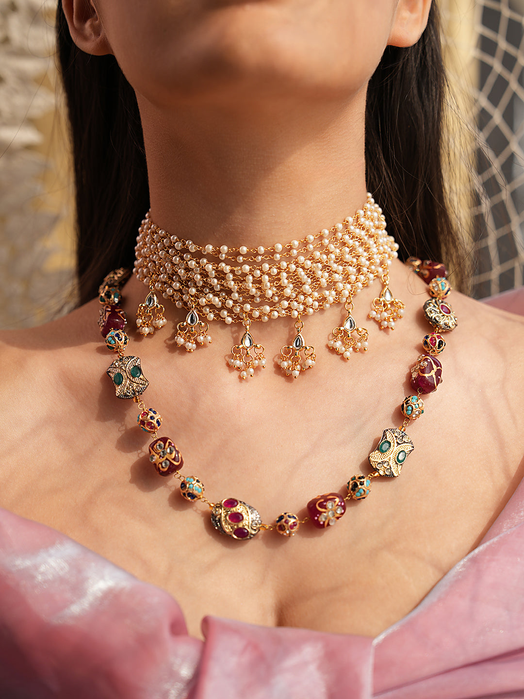 Varnika Layered Pearl Choker Necklace With Gold Beaded Pendants