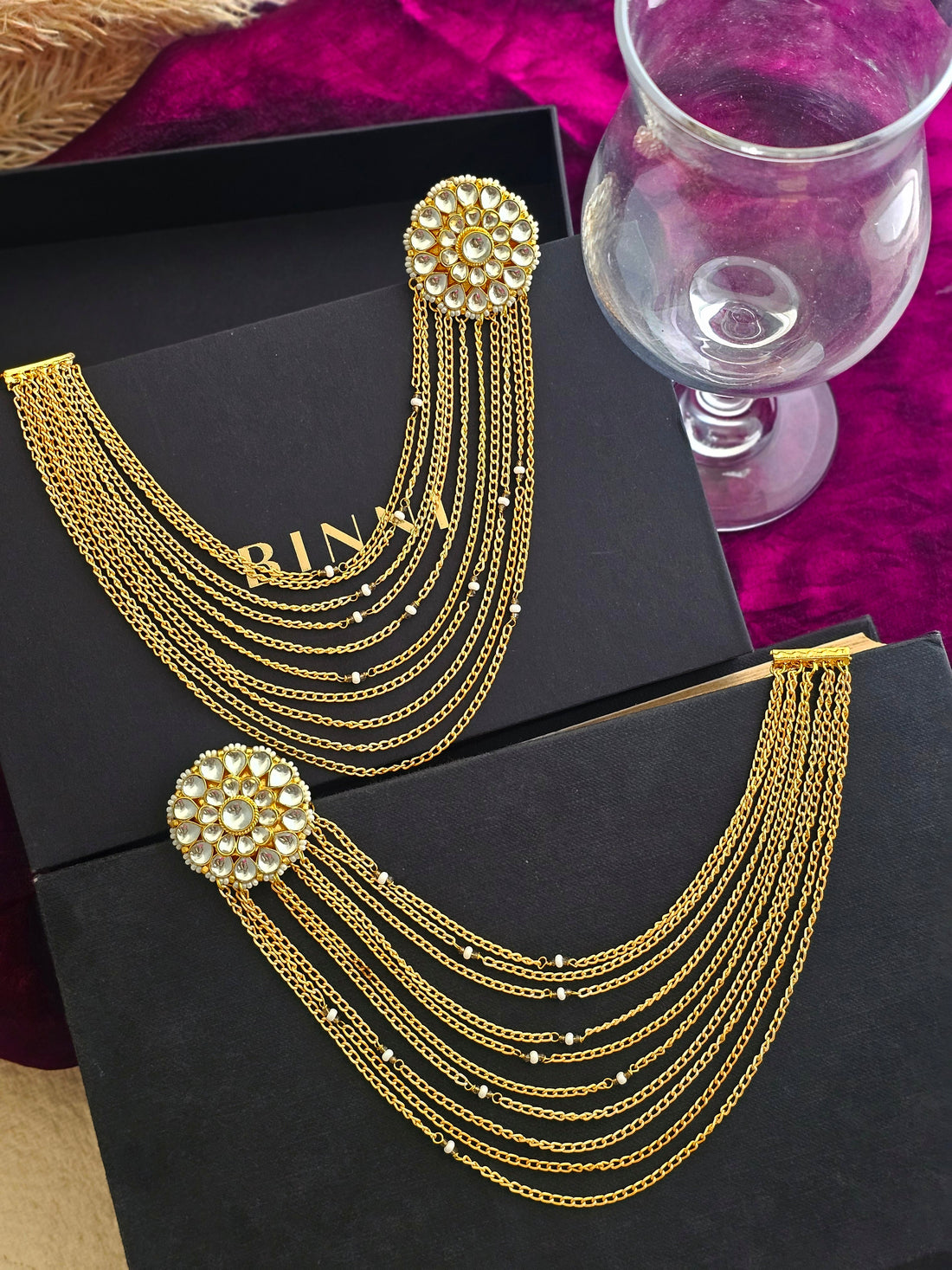 Elevate your style with this exquisite earchain, featuring intricate pachi kundan craftsmanship enhanced by delicate...