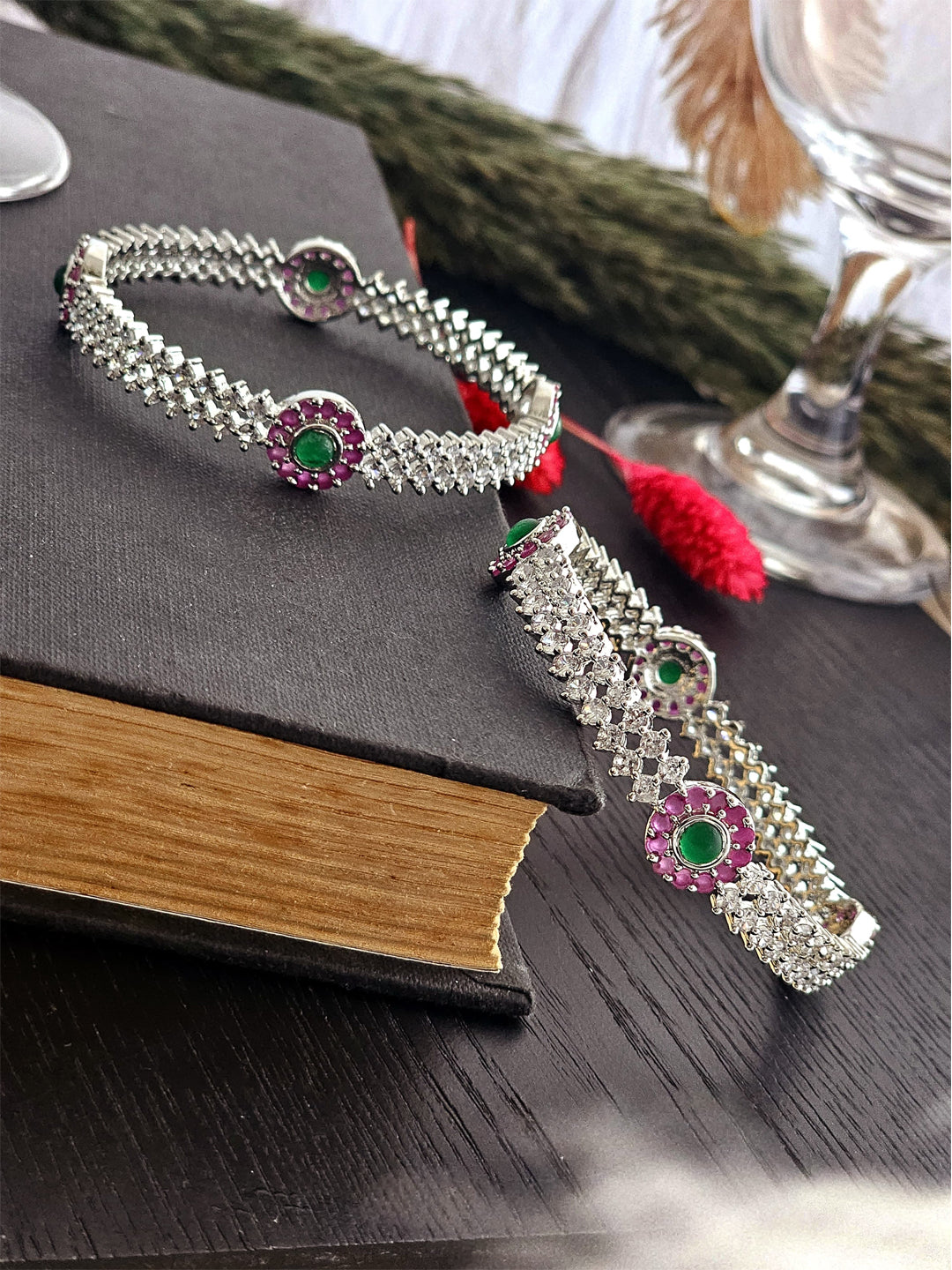 Experience the captivating charm of these bangles, where vibrant emerald-green stones intertwine seamlessly with the...