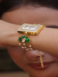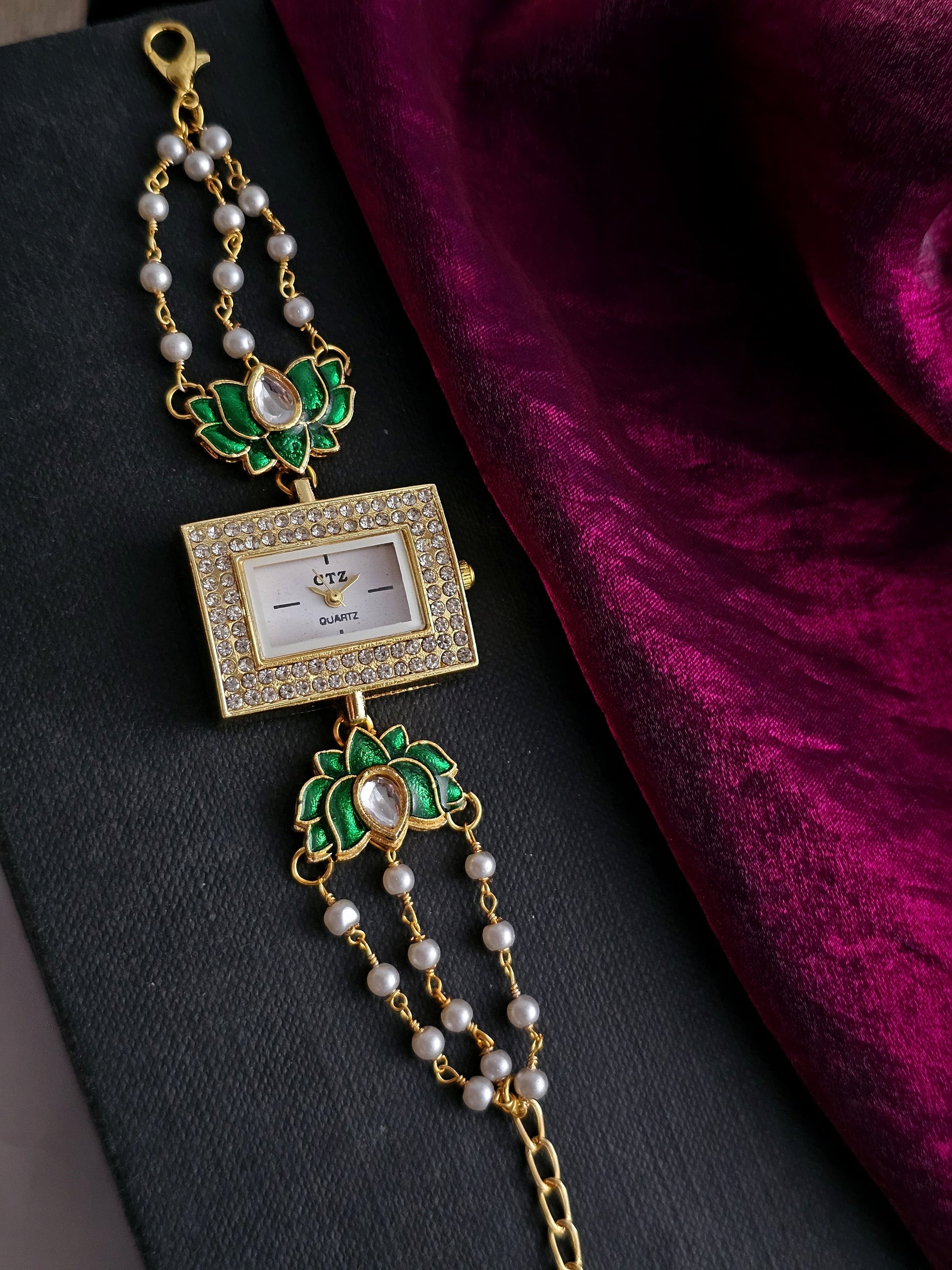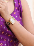 A timeless blend of tradition and elegance, this square-dial watch sparkles with AD-studded detailing, encircled by delicate seed pearls. The highlight is its exquisite lotus meenakari work, adding a touch of artistry to every glance.