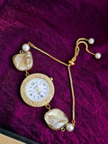 Crafted with raw, natural mother-of-pearl stones, this elegant watch blends timeless beauty with modern grace. The delicate gold frame enhances the lustrous MOP glow, while the crystal-studded dial adds a soft, radiant sparkle. A perfect fusion of style and serenity for your everyday elegance.