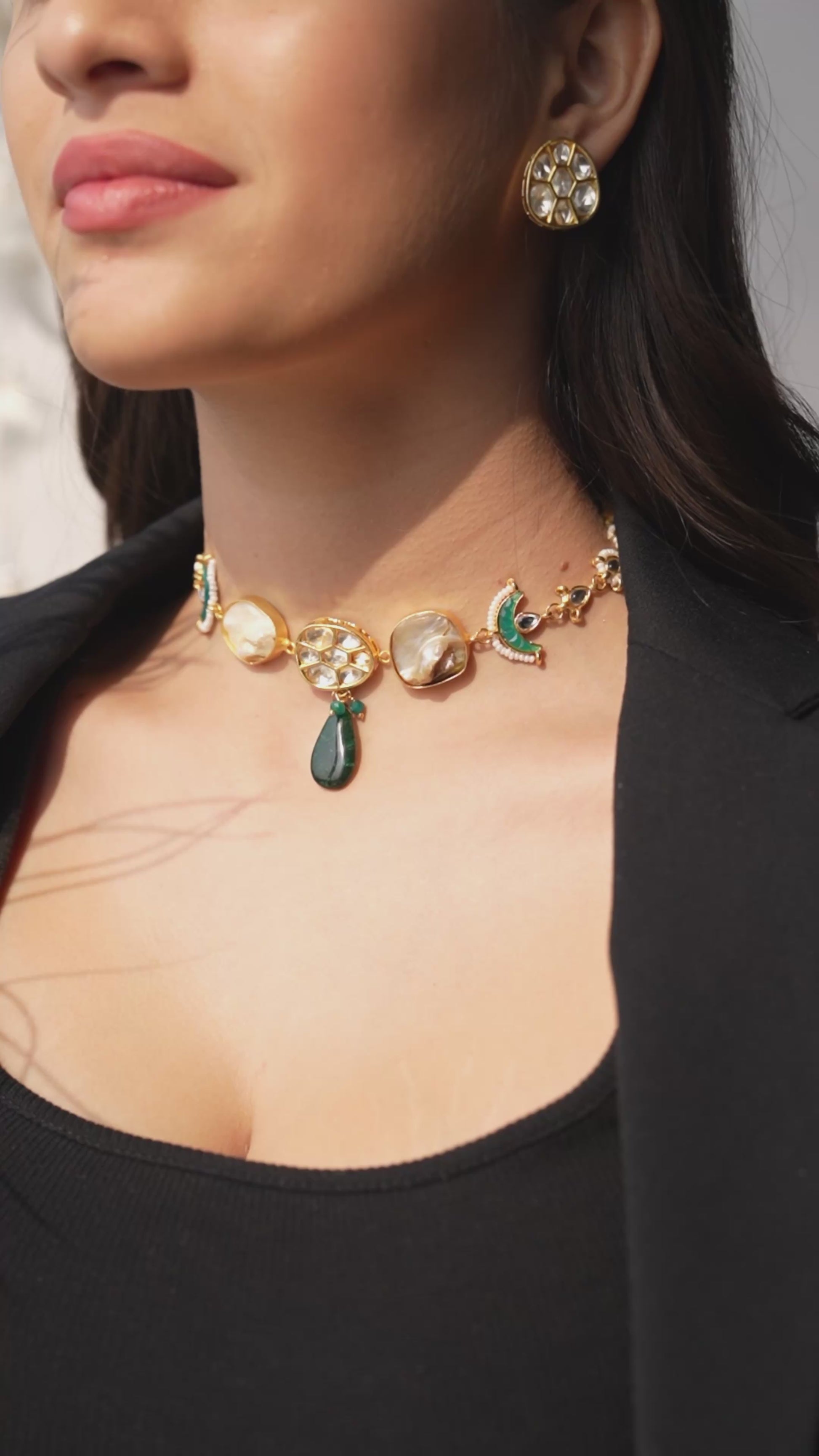 This elegant artisan craft showcases a beautifully handcrafted choker that blends semi-precious stones, intricate meenakari, pachi work, and detailed kundan accents, creating a striking piece that radiates traditional charm with a modern touch. Its artistry captures the essence of timeless beauty and exquisite craftsmanship.