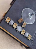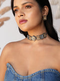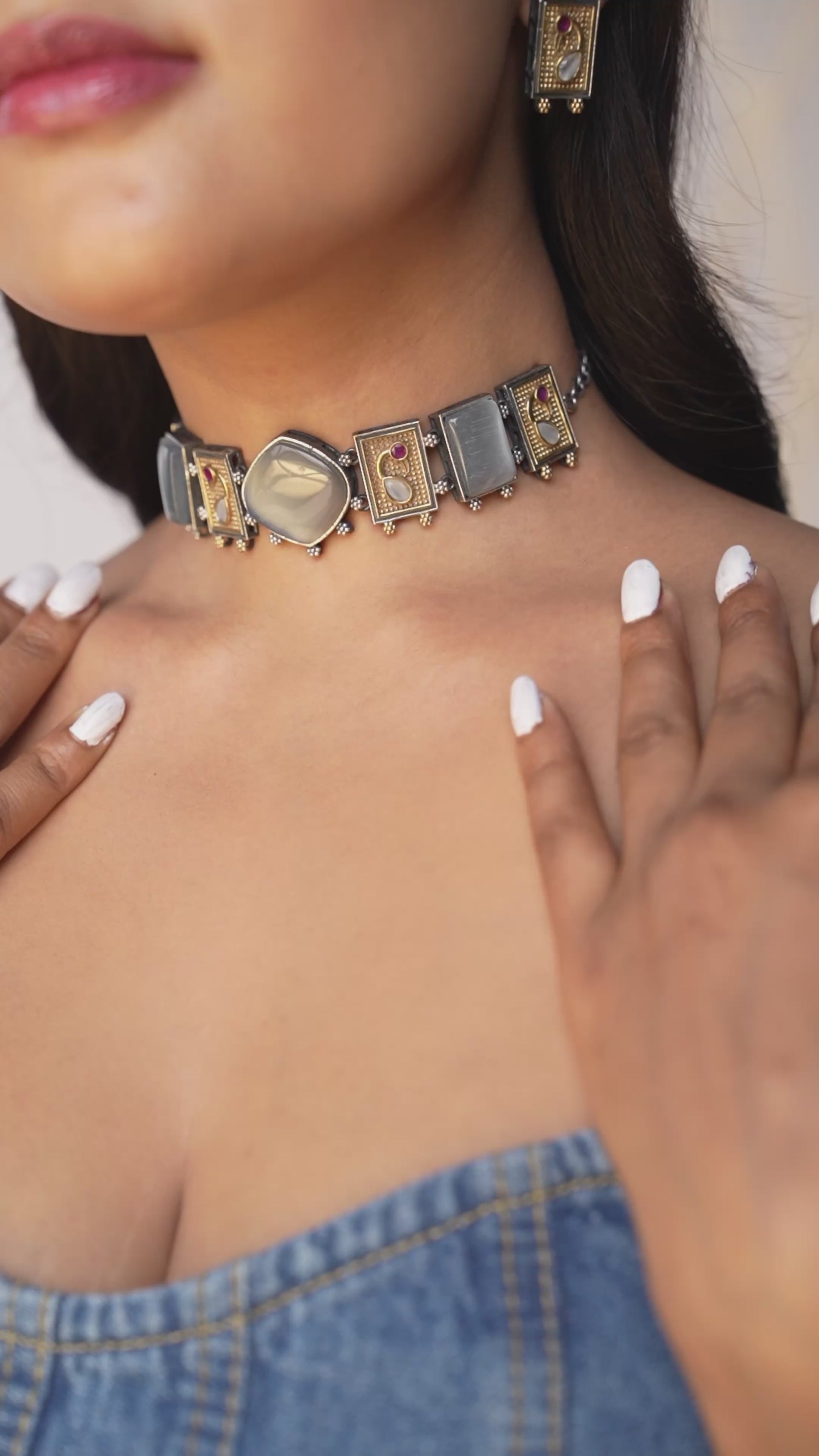 This exquisite choker showcases a unique block design, featuring rectangular blocks with intricate scrollwork and a striking pop of yellow, balanced beautifully by the elegant allure of grey gemstones. Each piece is thoughtfully crafted, making it a perfect fusion of boldness and grace.