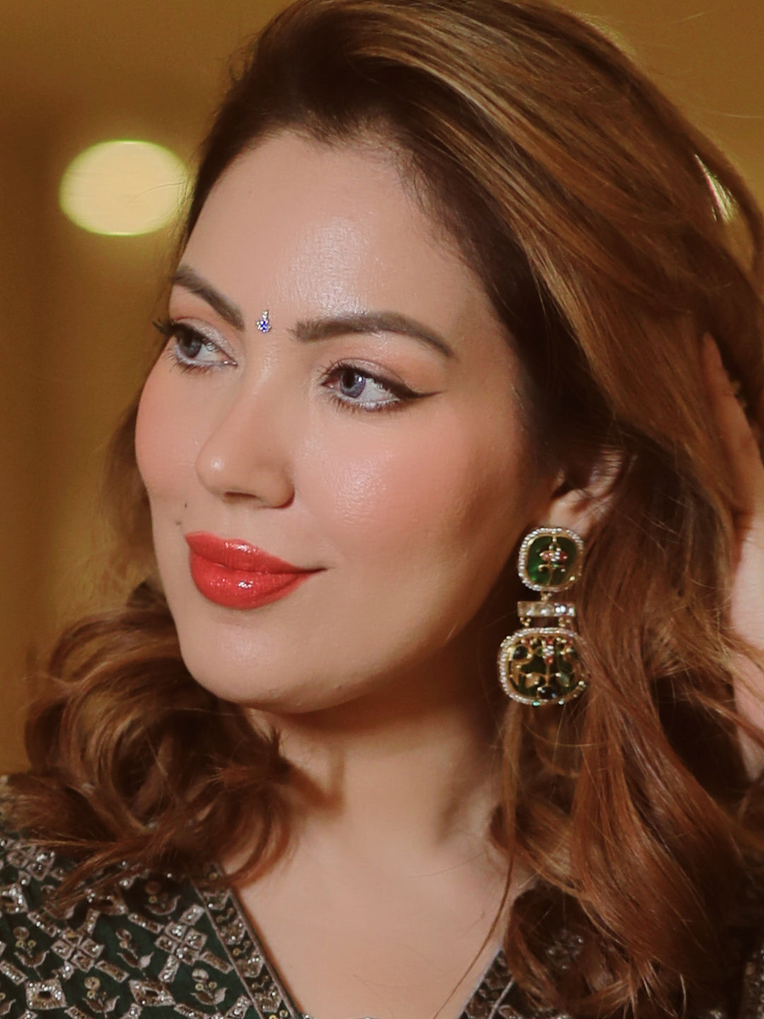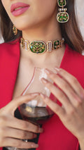 Immerse yourself in the charm of traditional artistry with the Handmade Meenakari Choker Set, a true masterpiece that reflects the beauty of classic craftsmanship. The choker features intricate meenakari work in a rich dark green hue, accentuated by elegant scrollwork details, creating a look that embodies timeless sophistication and grace.
