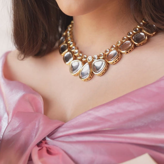 This stunning necklace set is handmade with love, featuring large kundans that exude elegance and showcase exceptional artistry. Each detail reflects the timeless charm of traditional craftsmanship, making it a standout piece in any jewelry collection.