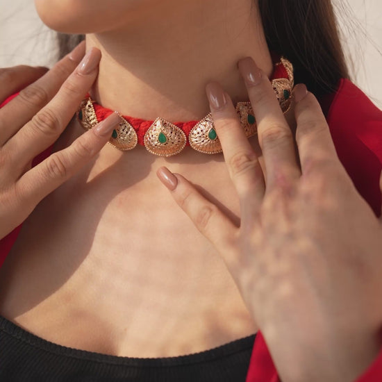 Adorn your neckline with this exquisite threaded choker, featuring a series of teardrop-shaped brass tumbles, each adorned with vibrant green gemstones. The meticulous arrangement creates a design that is both striking and elegant, perfect for making a statement.