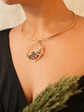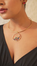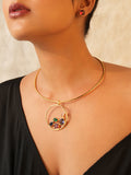 The necklace is centered around a circular pendant that is beautifully adorned with vibrant gemstones, creating a bold yet regal charm. The rich hues of the stones complement the gold-tone brass, adding depth and elegance to the overall design.