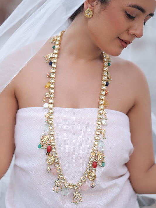 The necklace features detailed kundan work complemented by delicate rosy accents, creating a seamless fusion of tradition and modern style. Paired with beautifully coordinated earrings, this set elevates your look for weddings, festive gatherings, or any moment you wish to make unforgettable.