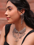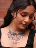 Step into a realm of refined elegance with this silver-plated necklace set, designed to exude timeless charm. A harmonious blend of bold sophistication and intricate craftsmanship, the necklace features a cascading dangler design that captures the ethereal glow of moonlight. Secured with a hook closure, it offers both comfort and a secure fit, ensuring you dazzle effortlessly.