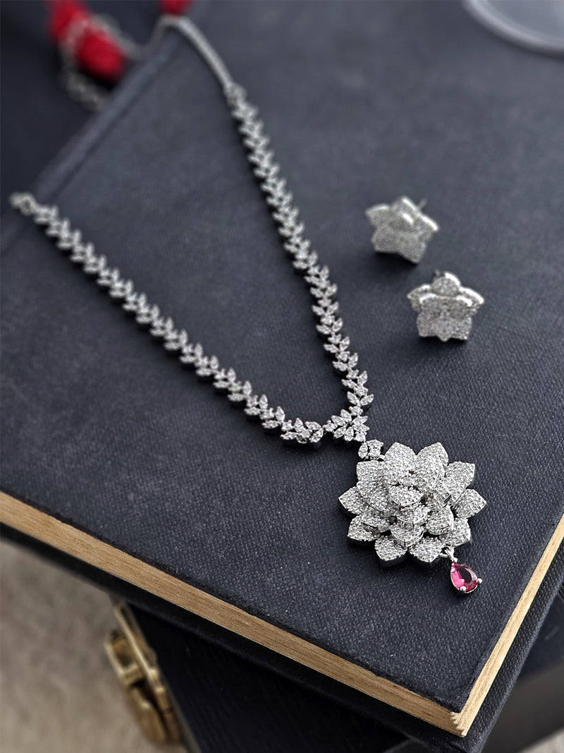 Introducing the Glimmer Spark Set, where brilliance meets elegance in every facet. This AD pendant necklace set radiates with a dazzling sparkle, capturing the light with every movement. The intricately crafted pendant, with its shimmering American Diamonds, creates an aura of timeless beauty, while the matching necklace adds a touch of sophistication and grace.