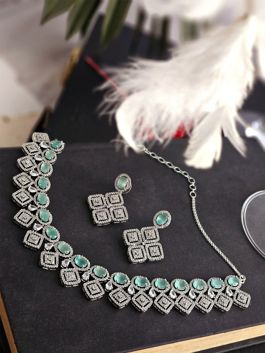 Dive into a refreshing world of elegance with the Aqua Mist Set, a stunning AD necklace set that captures the serene beauty of mint green. Featuring delicate aqua stones surrounded by the radiant sparkle of American Diamonds, this set evokes the calm of misty waters and the purity of a tranquil breeze.