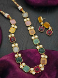 This necklace set is a breathtaking ensemble that exudes timeless elegance and vibrant charm. Featuring a cascading design adorned with real Monalisa stones, kundans, and high-quality brass craftsmanship, it creates a harmonious blend of sparkle and sophistication. The thoughtful arrangement of these elements enhances its versatility, making it ideal for both grand occasions and everyday refinement.