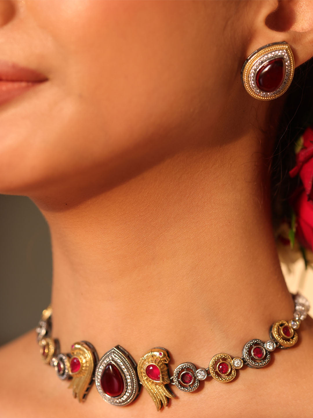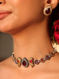 A stunning dual-tone finish brings depth and elegance to this choker, crowned with a graceful peacock charm and a rich maroon stone that anchors the entire design with royal warmth.