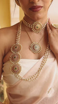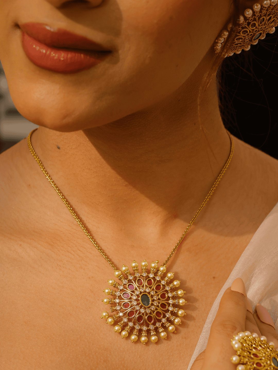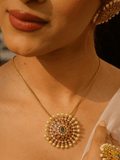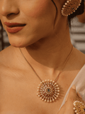 Glow Essence Set is a beautifully designed chain pendant set featuring a classic gold chain paired with an elegant circular pendant. The pendant is highlighted with a luminous white pearl at the center, enhanced by delicate ruby accents that add a touch of richness and charm. The perfect blend of gold, pearl, and ruby creates a timeless and graceful look, making it an ideal choice for festive occasions, celebrations, and everyday elegance, from Binnis.