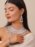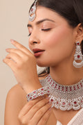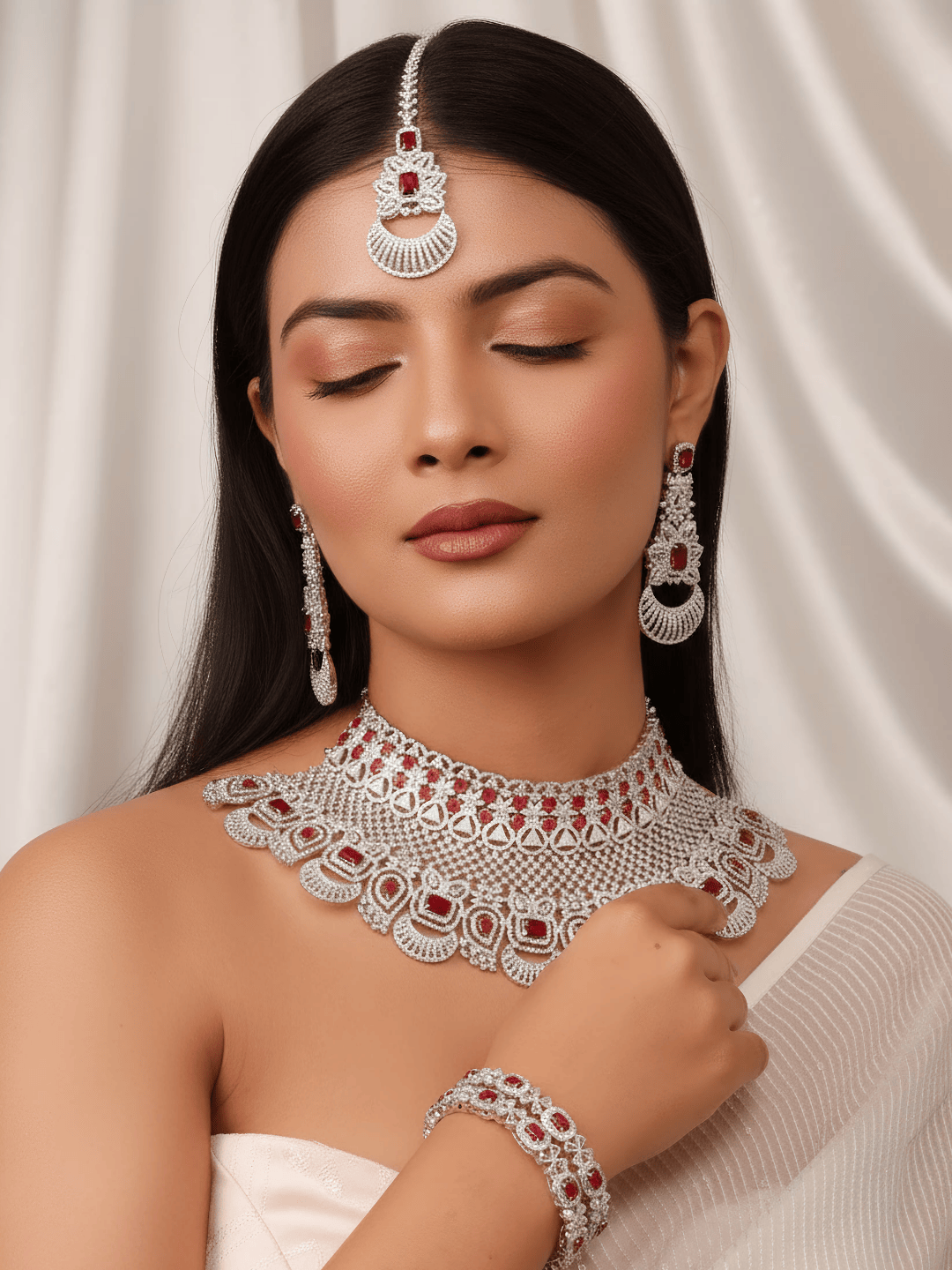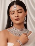 stunning silver American diamond necklace with matching earrings and matha patti, accented with a touch of pink diamonds for a soft, radiant glow. Perfect for brides seeking elegance with a hint of color.