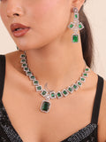 A complete stunner featuring an AD-studded emerald green necklace, matching earrings, and a coordinating emerald green American diamond bracelet. Perfect for a regal and elegant festive look.