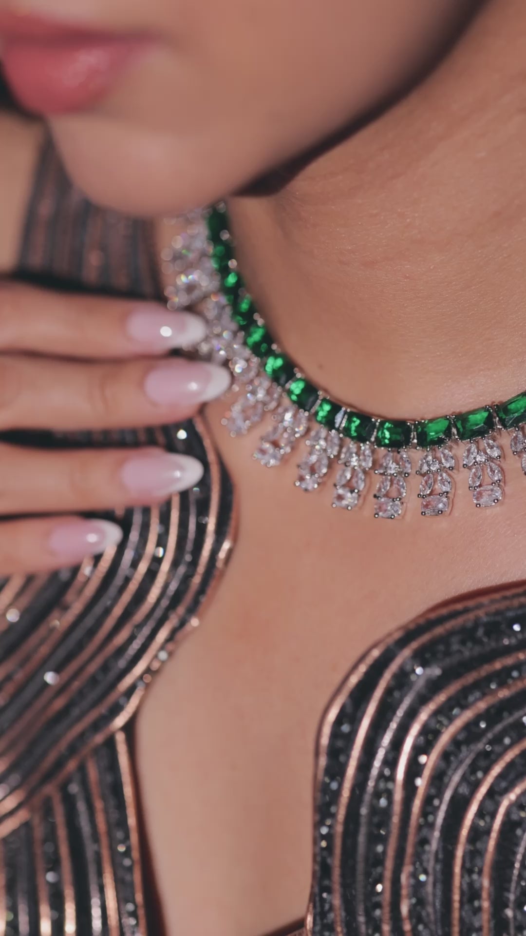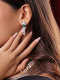 A stunning blend of emerald green and silver American diamonds creates this elegant necklace set, adding a touch of sophistication and sparkle to any festive or party look.