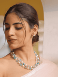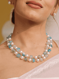 A serene blend of elegance and soft radiance, this two-layer mala set features lustrous glass pearls beautifully paired with striking blue glass stones. The gentle contrast of cool blue tones against the classic pearl strands creates a look that feels both refreshing and refined.
