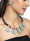 The set is completed with matching circular peacock frame stud earrings, designed to echo the necklace’s elegance. These earrings come with secure push-back closures for ease and convenience, making them perfect for extended wear.
