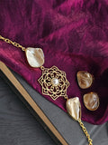 Delight in the charm of this elegant mother of pearl choker set, a perfect blend of sophistication and modern style. Featuring a gold-plated brass flower pendant, the choker is beautifully adorned with delicate mother-of-pearl stones, adding a radiant allure and refined touch.