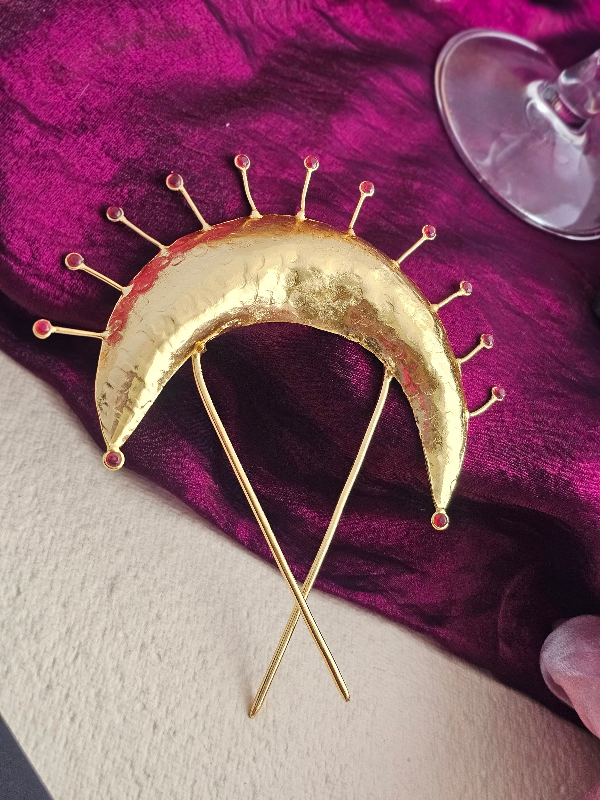 A radiant moon-inspired hair pin crafted in glowing golden tones, this piece brings a soft celestial charm to your hairstyle. Its curved Chandra silhouette adds elegance and grace, making it perfect for festive, bridal, or everyday traditional looks.