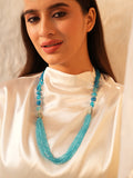 Accentuating the necklace are semi-precious stone beads in a gradient of dark-blue to light-blue hues, interspersed throughout the strands. These beads add a refined depth and sparkle, enhancing the overall aesthetic and elevating the piece to a statement of timeless beauty.