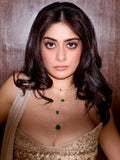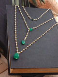 At the heart of this masterpiece lies a dangling jade stone centerpiece on each layer, adding vibrant sophistication. Paired with a luxurious gold-toned brass base, the design perfectly complements the pearls and jade, offering a harmonious blend of timeless opulence and modern elegance.