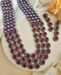 Wrap yourself in the captivating allure of this stunning necklace set, where deep red stones cascade across multiple layers with mesmerizing grace. This striking ensemble blends bold color with elegant design, making it perfect for those who love to make a statement.