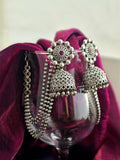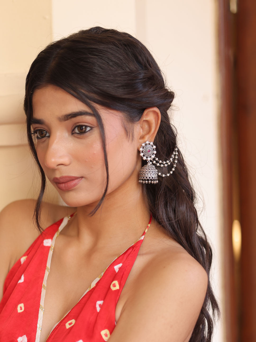Embrace timeless elegance with these silver-plated brass earrings, featuring classic jhumka designs adorned with delicate dangling beads for a touch of grace. The intricate ear chain adds a unique charm, seamlessly blending traditional artistry with modern sophistication.