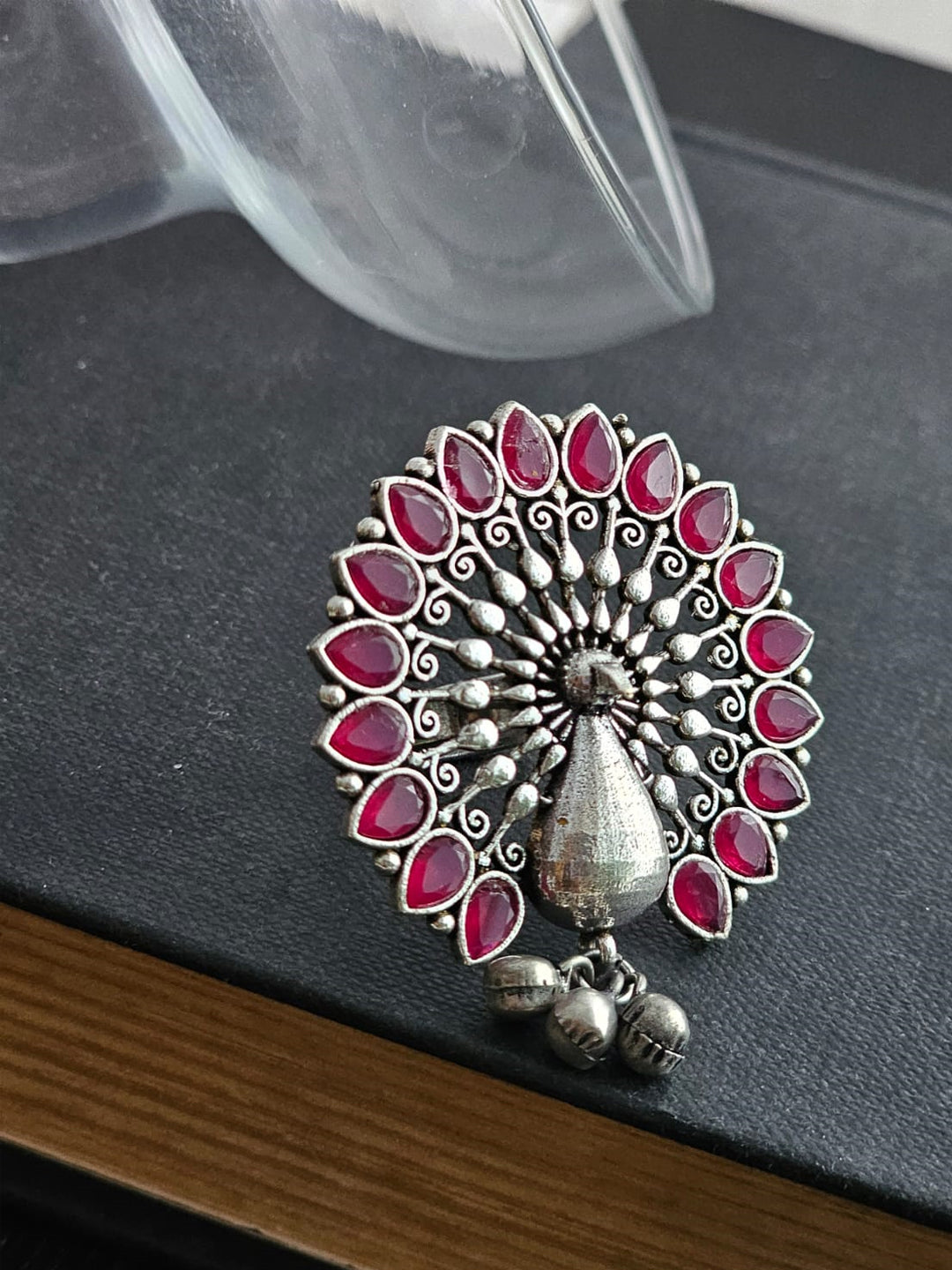 Celebrate timeless elegance with this silver-plated masterpiece, designed to captivate with its intricate craftsmanship and regal allure. Featuring a stunning peacock motif adorned with ruby-studded kundan work, this finger ring is a symbol of opulence and grace.