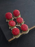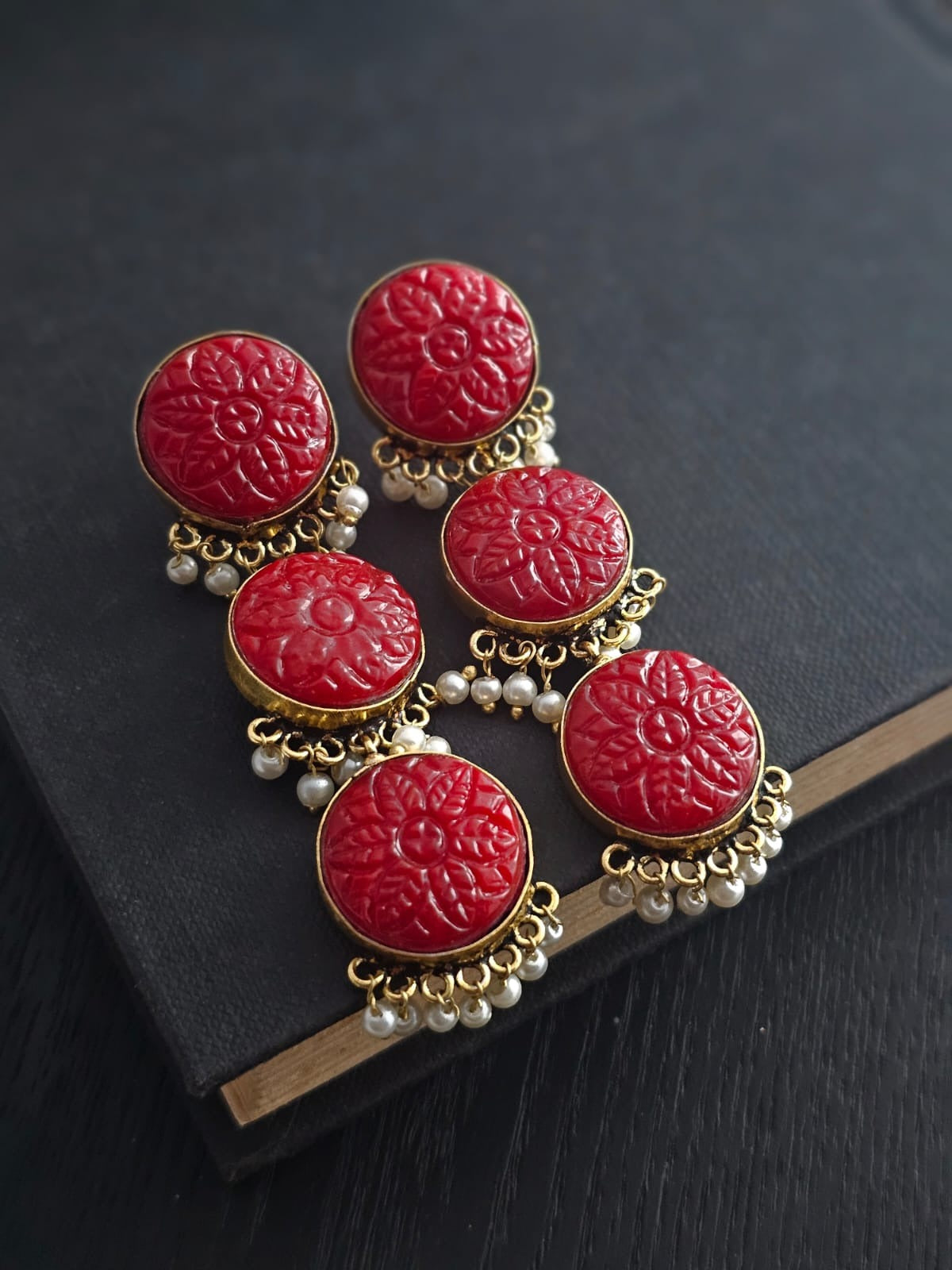 Elevate your style with these exquisitely designed earrings, featuring intricately carved red Monalisa stones arranged in a captivating floral pattern hanging pearls. The artistry of the design exudes sophistication and timeless elegance, making them a statement piece for any occasion.