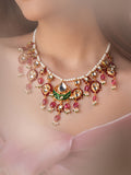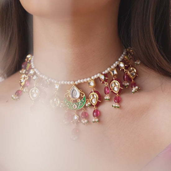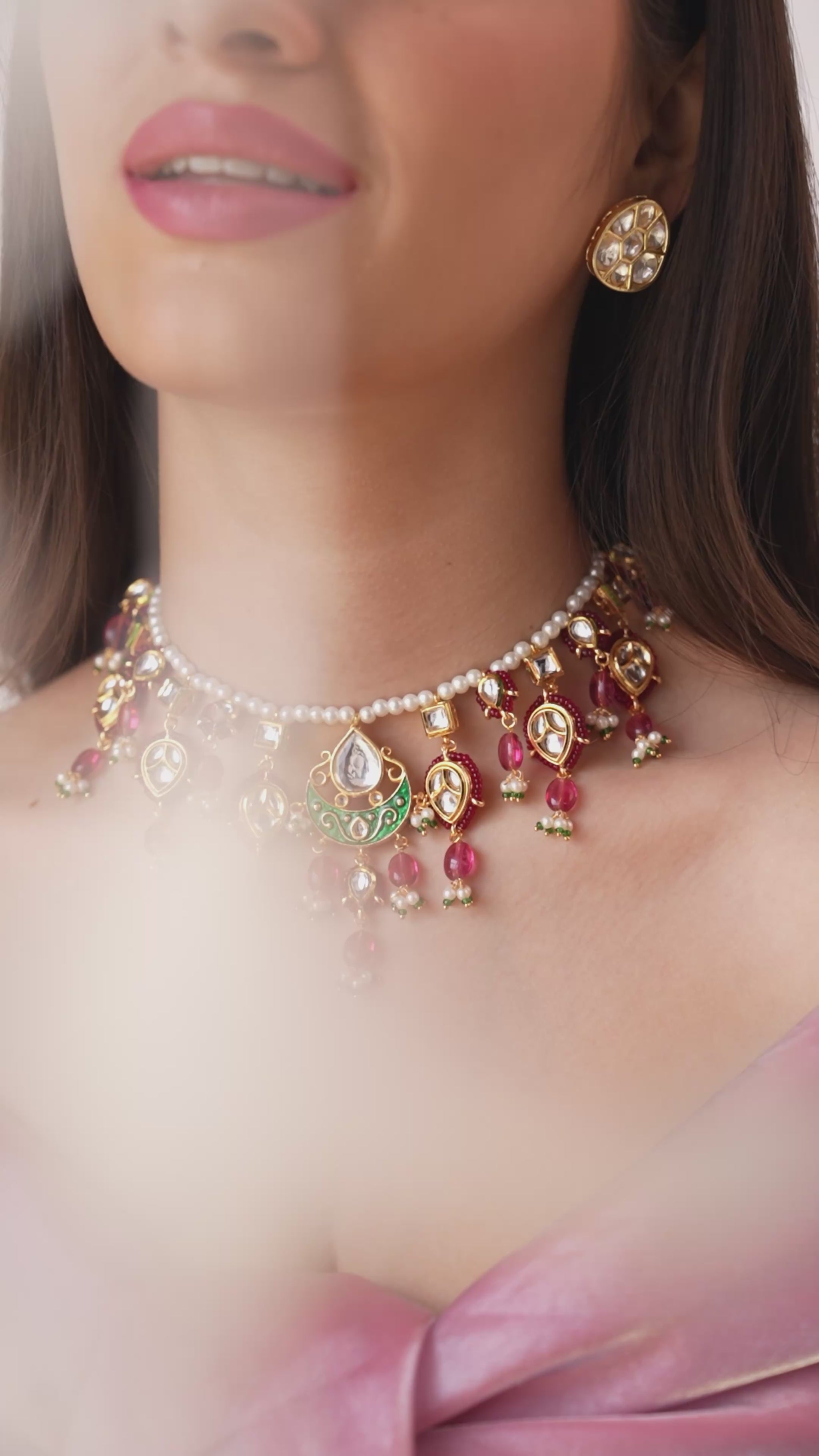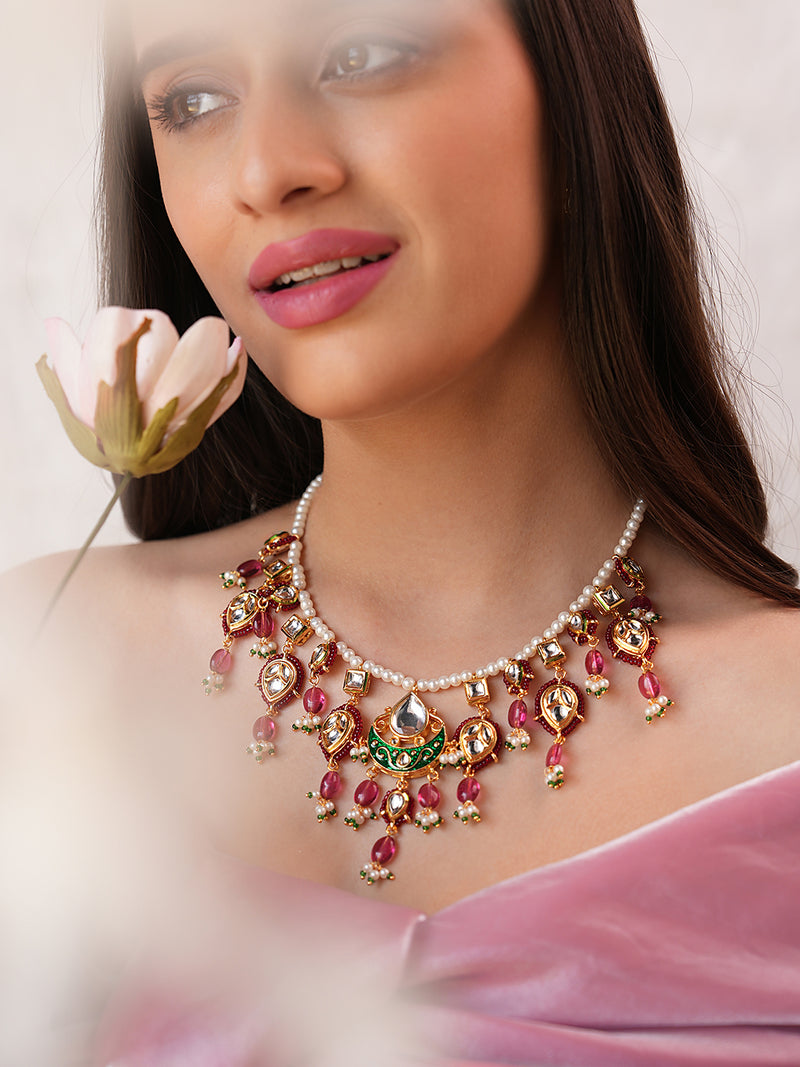 This necklace is a ruby-hued delight, showcasing vibrant quartz stones in a striking ruby shade, elegantly paired with kundan accents. The rich color palette and refined design make it a perfect blend of tradition and timeless elegance, effortlessly elevating your style.