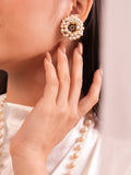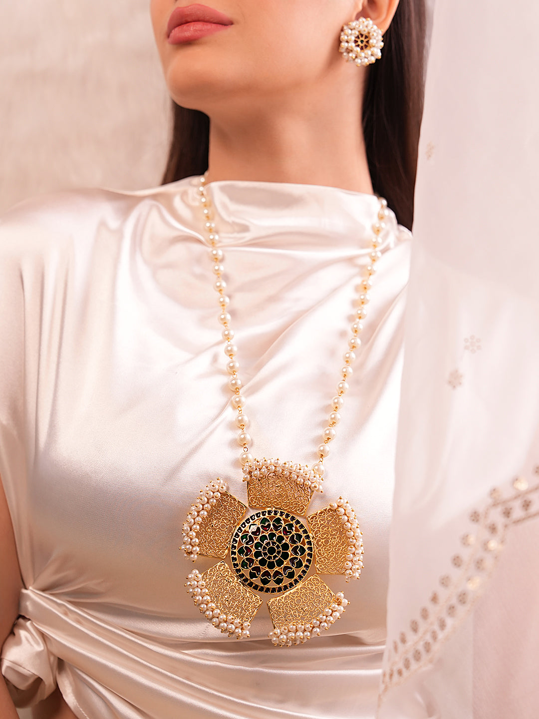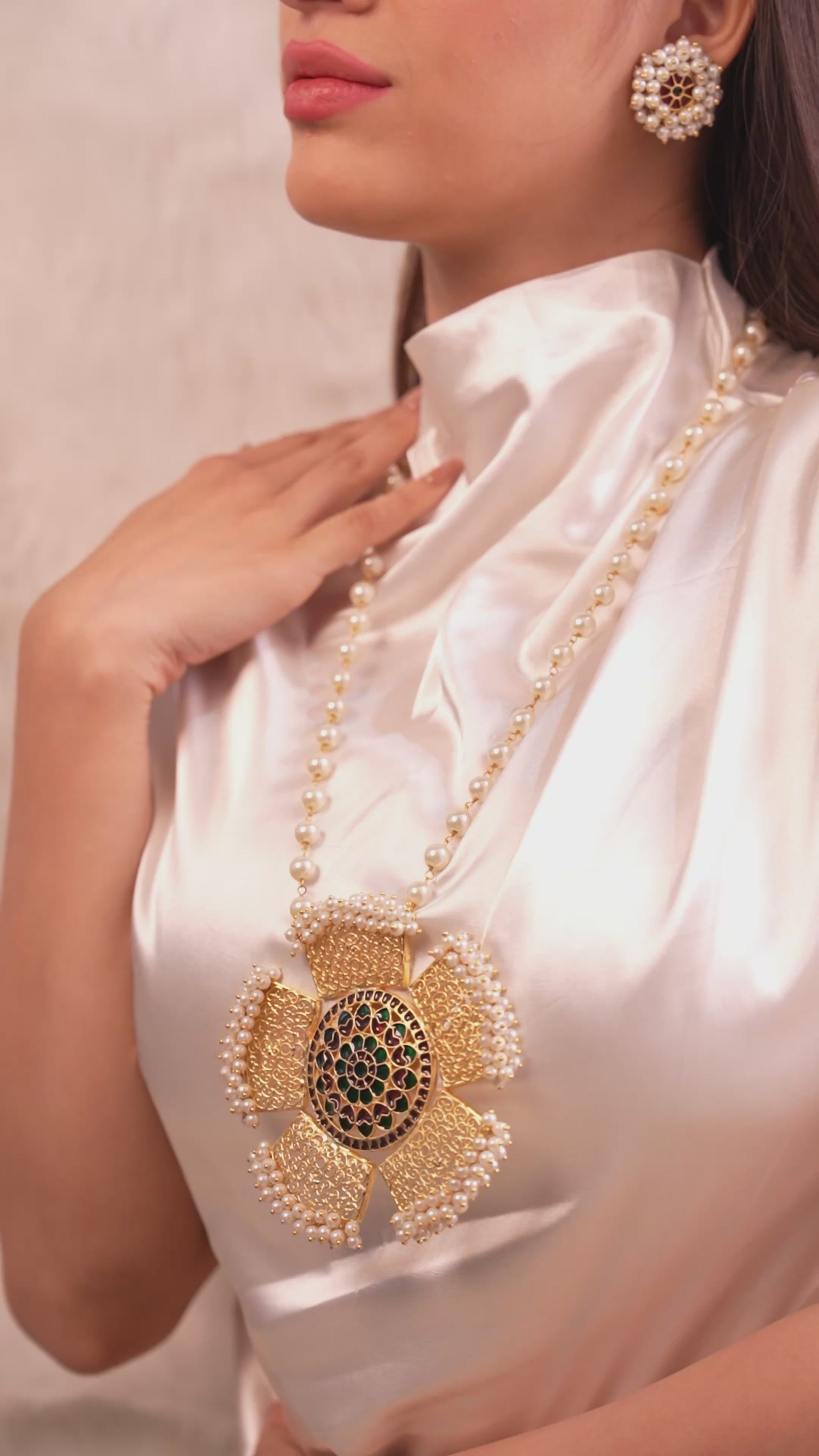 At the heart of the necklace lies a flower-shaped pendant, intricately crafted with a gold-toned filigree pattern. Its center is adorned with a circular arrangement of red and green gemstones, adding a pop of color and a regal touch to the design. Complementing the necklace are matching stud earrings, featuring similar gemstone patterns and pearl detailing, perfectly harmonizing with the pendant.