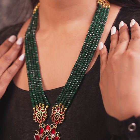 Adorn yourself with the Layered Elegance Necklace Set, a timeless blend of tradition and sophistication. The necklace showcases multiple strands of emerald green beads arranged in a layered fashion, beautifully complemented by a traditional Meenakari pendant featuring intricate floral motifs in maroon and red hues. This design embodies the richness of heritage and the allure of modern craftsmanship.