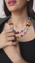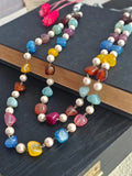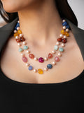 This delicate two-layer design features a beautiful mix of multicolor semi-precious quartz stones, carefully interspersed with pearls, creating a vibrant yet elegant statement piece. The combination of these stones gives the necklace a dynamic, yet refined look, making it the perfect accessory for any occasion.