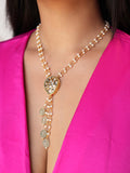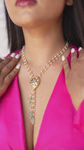 The Delicate Pearl Necklace showcases a dainty design with a teardrop-shaped kundan pendant, beautifully complemented by a chain of dangling pearls at the bottom. This piece strikes a perfect balance between elegance and simplicity, making it a versatile addition to any jewelry collection.