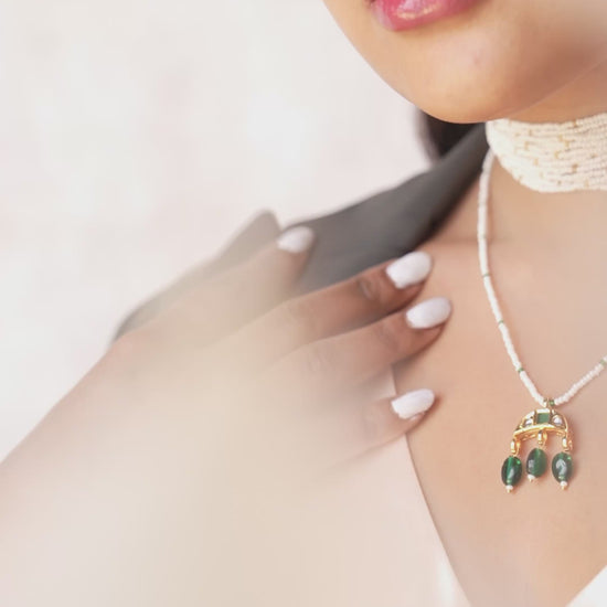 This elegant combo set features a stylish pairing of a white multi-strand beaded choker and a delicate crescent-shaped pendant. Together, they create a chic and contemporary layered look, blending timeless design with modern sophistication.