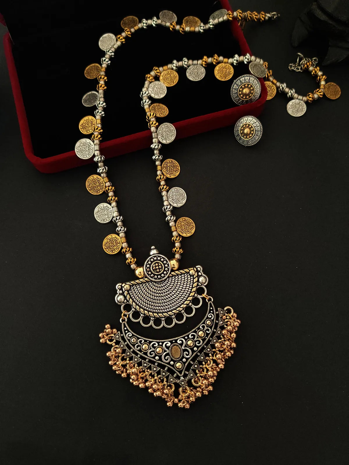 Grace your neckline with this dual-tone long pendant necklace, where elegance meets contemporary flair. This stunning piece showcases a beautifully crafted pendant that blends warm gold and sleek silver tones, creating a captivating contrast.