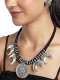Embrace spirituality and elegance with this captivating necklace, a harmonious blend of traditional artistry and contemporary design. At its heart lies a brass Ganpati pendant, symbolizing wisdom and prosperity, complemented by crescent-shaped accents that add a celestial charm to the design.
