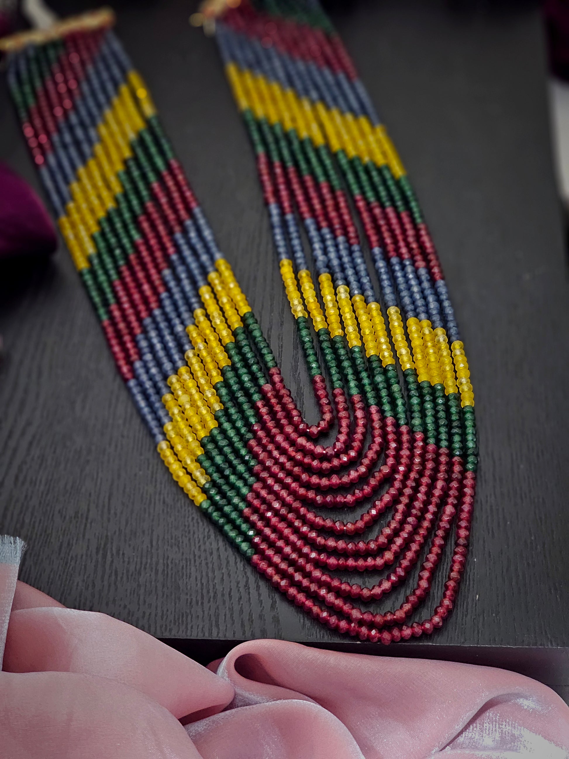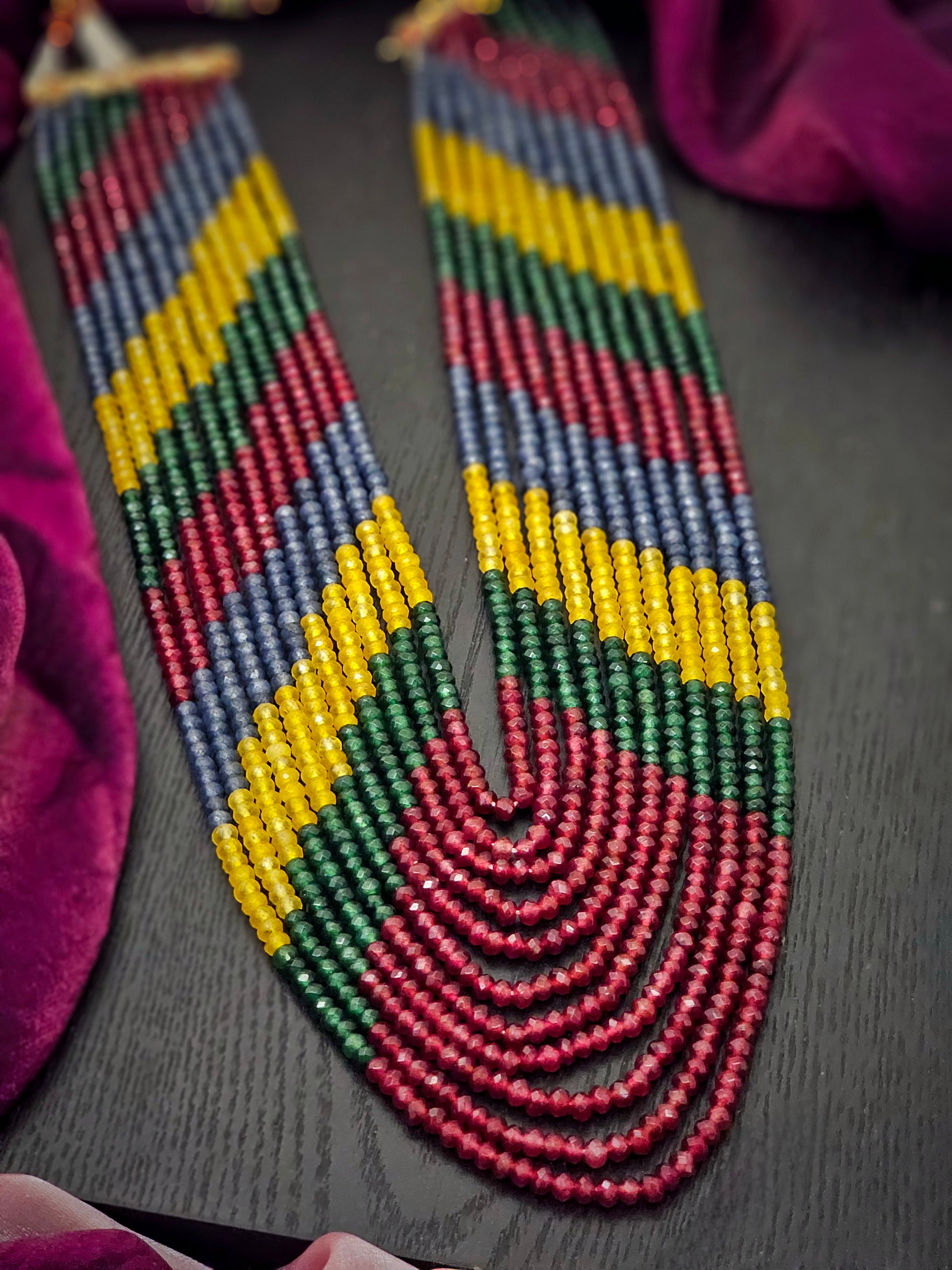 Celebrate vibrant elegance with this stunning multicolored layered long necklace that brings a burst of color and life to your ensemble. Crafted with an artful mix of stones and beads in rich, radiant hues, this necklace creates a mesmerizing cascade of shades that dance with every movement.