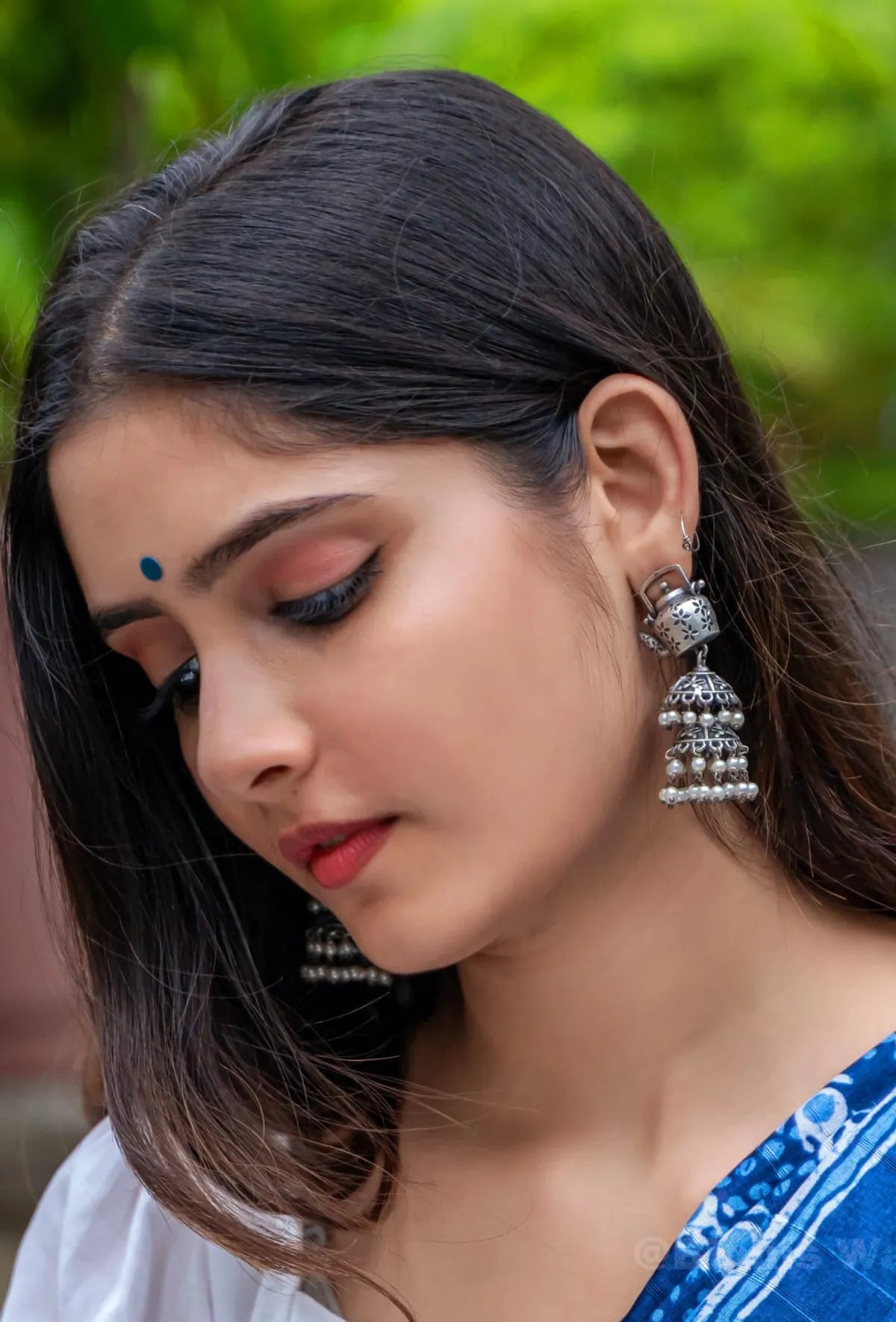 The final jhumka is adorned with delicate pearls that sway gracefully, adding a soft and sophisticated finish to the design. Crafted from premium brass with an oxidized silver plating, these earrings offer a vintage-inspired aesthetic that pairs effortlessly with ethnic and fusion wear.
