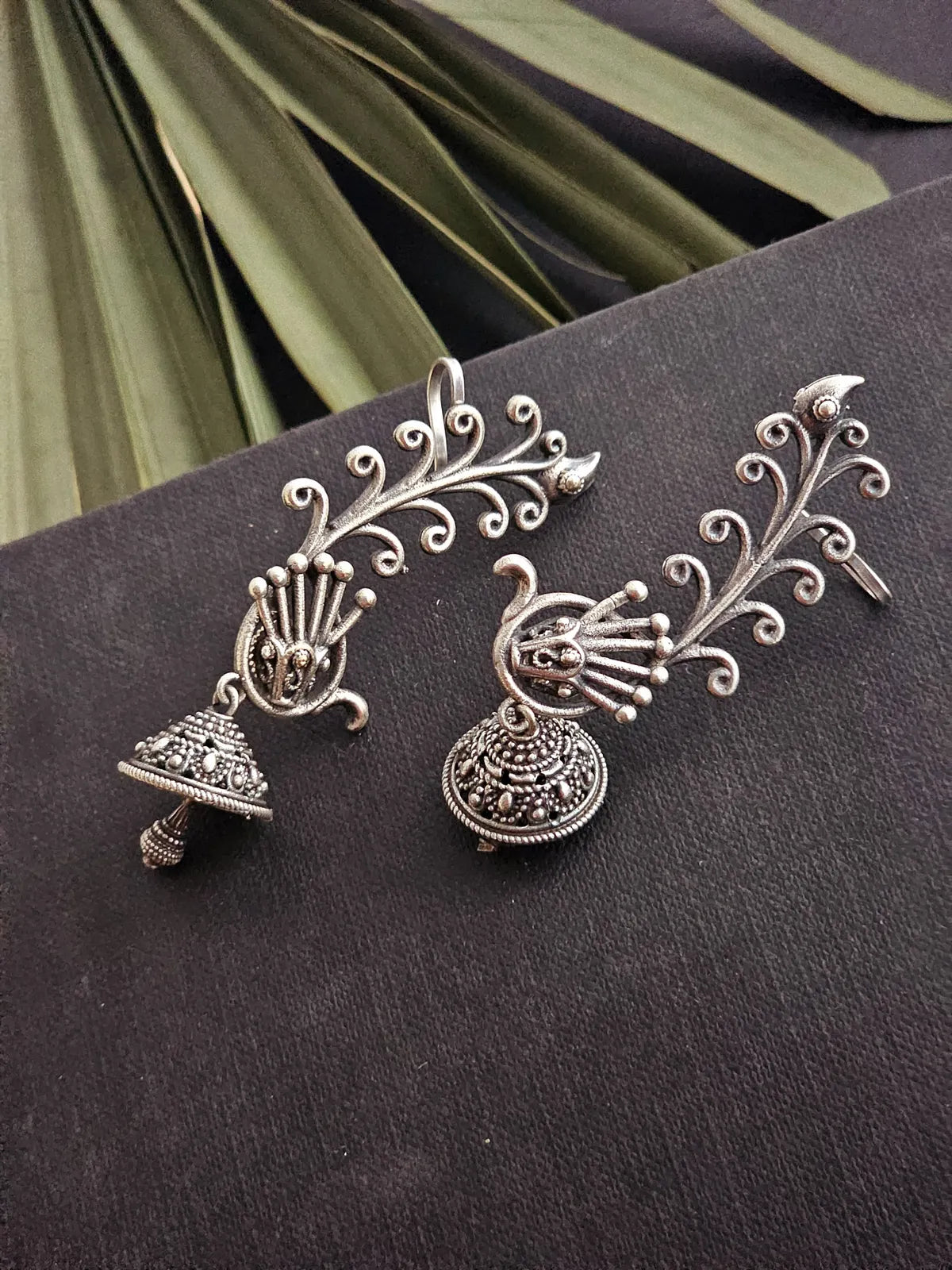 Made from high-quality brass and finished with a radiant silver coating, these ear cuffs are perfect for adding a touch of grace to both traditional and modern outfits. Their detailed craftsmanship and distinctive design make them a statement piece for any occasion.