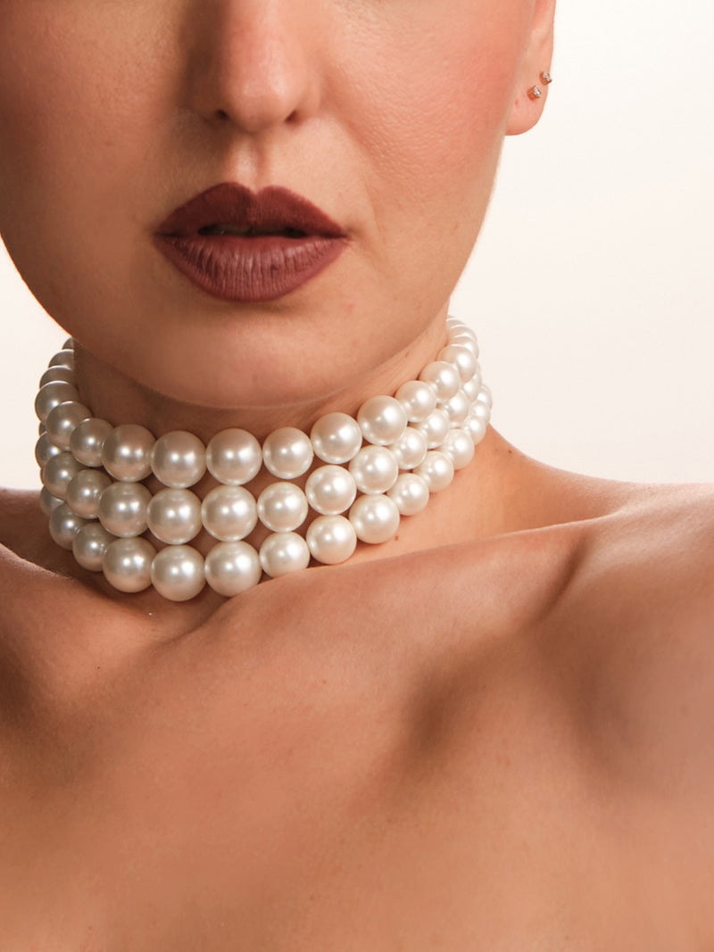 Classic with a statement twist, the Trilaya Freshwater Pearl Choker features three graceful layers of luminous freshwater pearls, artfully arranged to embrace the neckline with elegance and depth.