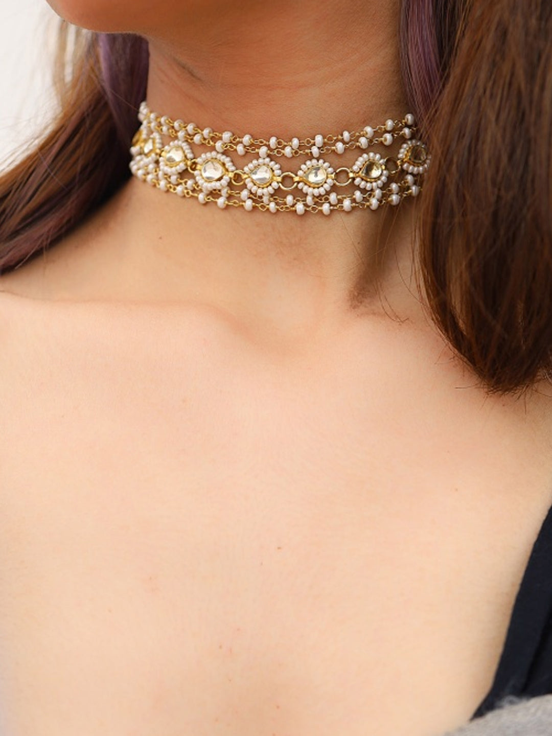 A delicate embrace of elegance, this choker features fine seed pearls woven with minimalistic pachi kundan detailing at the center. Understated yet refined, it brings timeless charm to your neckline — perfect for modern traditional looks and intimate celebrations.