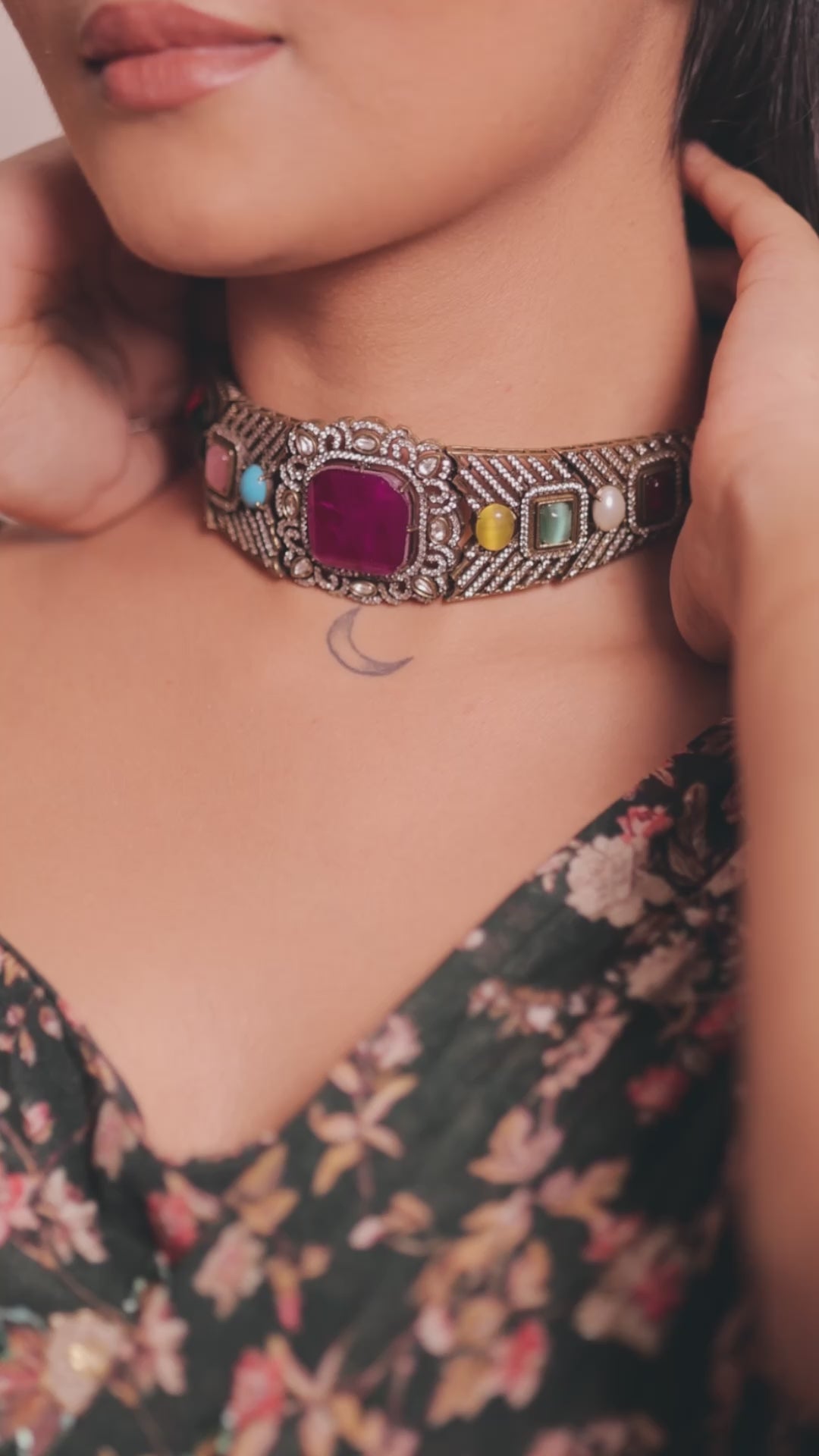 A stunning statement choker crafted on a pure brass base, adorned with shimmering American diamonds for a bold yet elegant festive look.