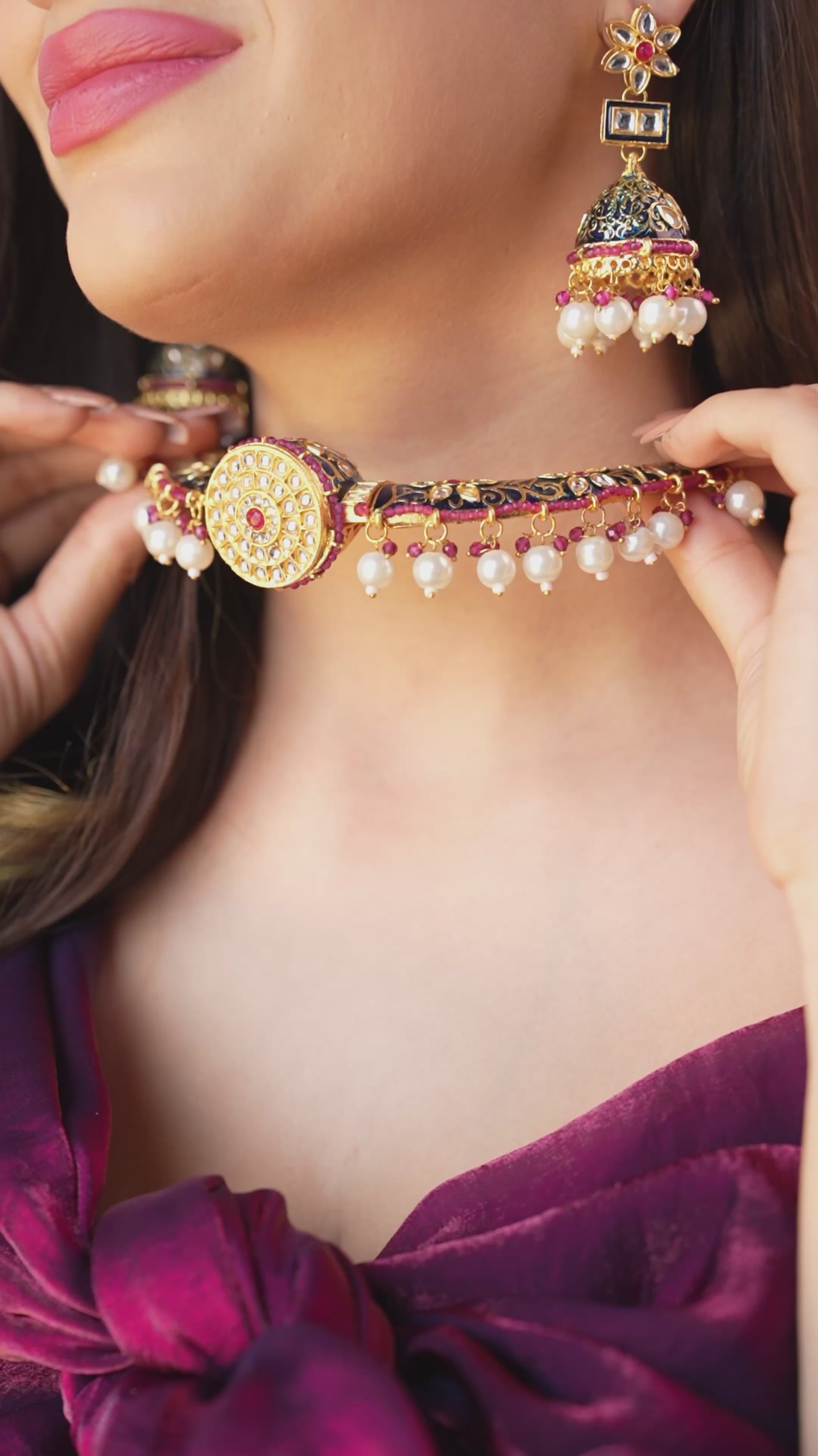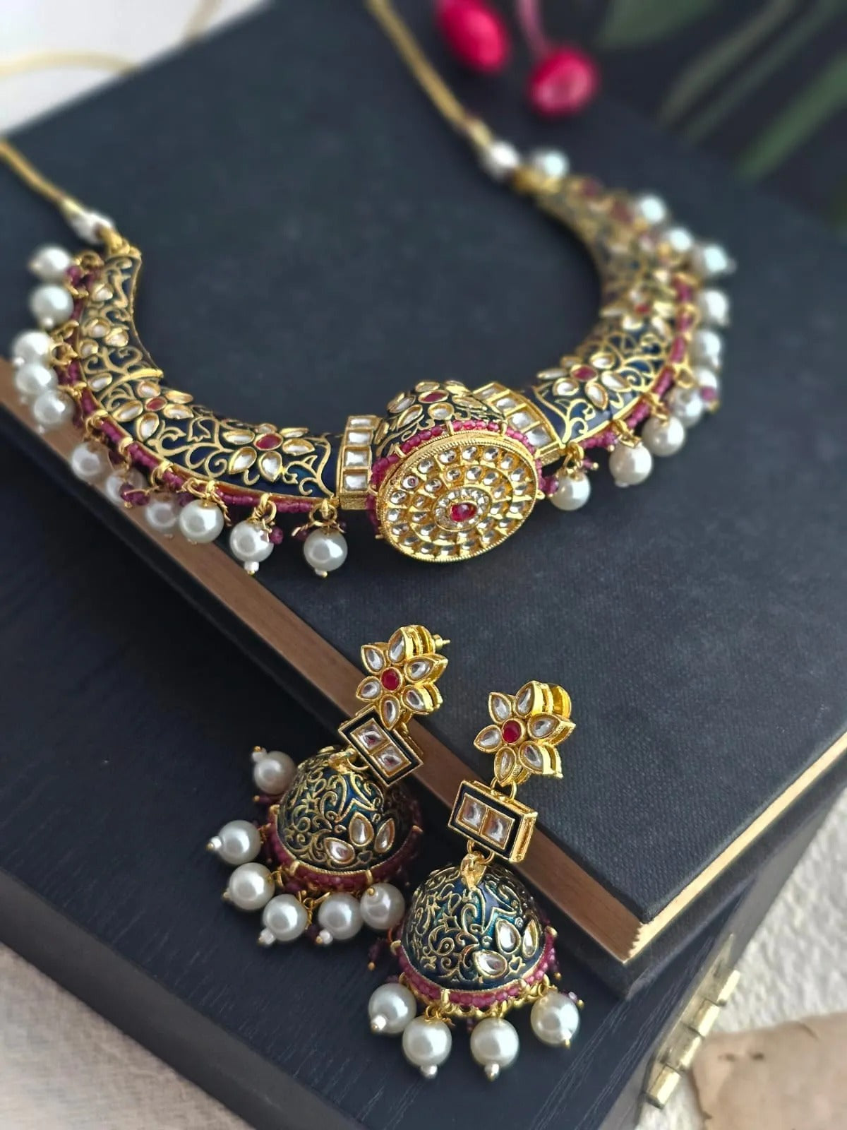 The crescent-shaped choker is a captivating fusion of traditional Meenakari artistry and modern elegance. Its intricate floral motifs, gleaming stones, and lustrous white pearls flow together beautifully, while a striking peacock blue central medallion adds a regal and bold touch. Paired with matching jhumka earrings, featuring delicate gemstone accents, this set epitomizes timeless beauty and sophistication.