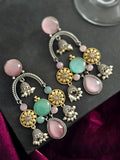 Enhance your elegance with these Monalisa stone long earrings, showcasing a captivating blend of modern design and timeless charm. Set on a durable brass base with a shimmering silver-plated finish, their graceful dangling design adds a dynamic touch to your every movement.