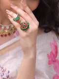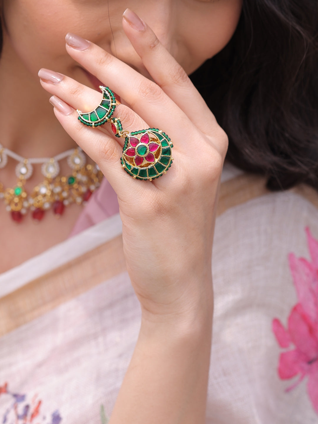 Capture the beauty of nature and celestial charm with this exquisite ring, featuring a radiant green kundan flower framed by a crescent moon design. The harmonious blend of floral and lunar elements creates a piece that exudes elegance and mystique, perfect for those who appreciate unique and meaningful jewelry.