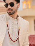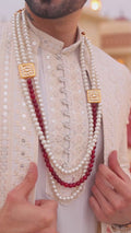 Rajveer Necklace is a bold and elegant design crafted for a royal look. It features a graceful white pearl layer that adds timeless beauty, with a striking maroon pearl in the middle as the centerpiece, creating a rich and powerful contrast. The combination of soft white pearls and deep maroon tones symbolizes purity, strength, and confidence, making this necklace perfect for traditional occasions, festive wear, and special celebrations Binnis.