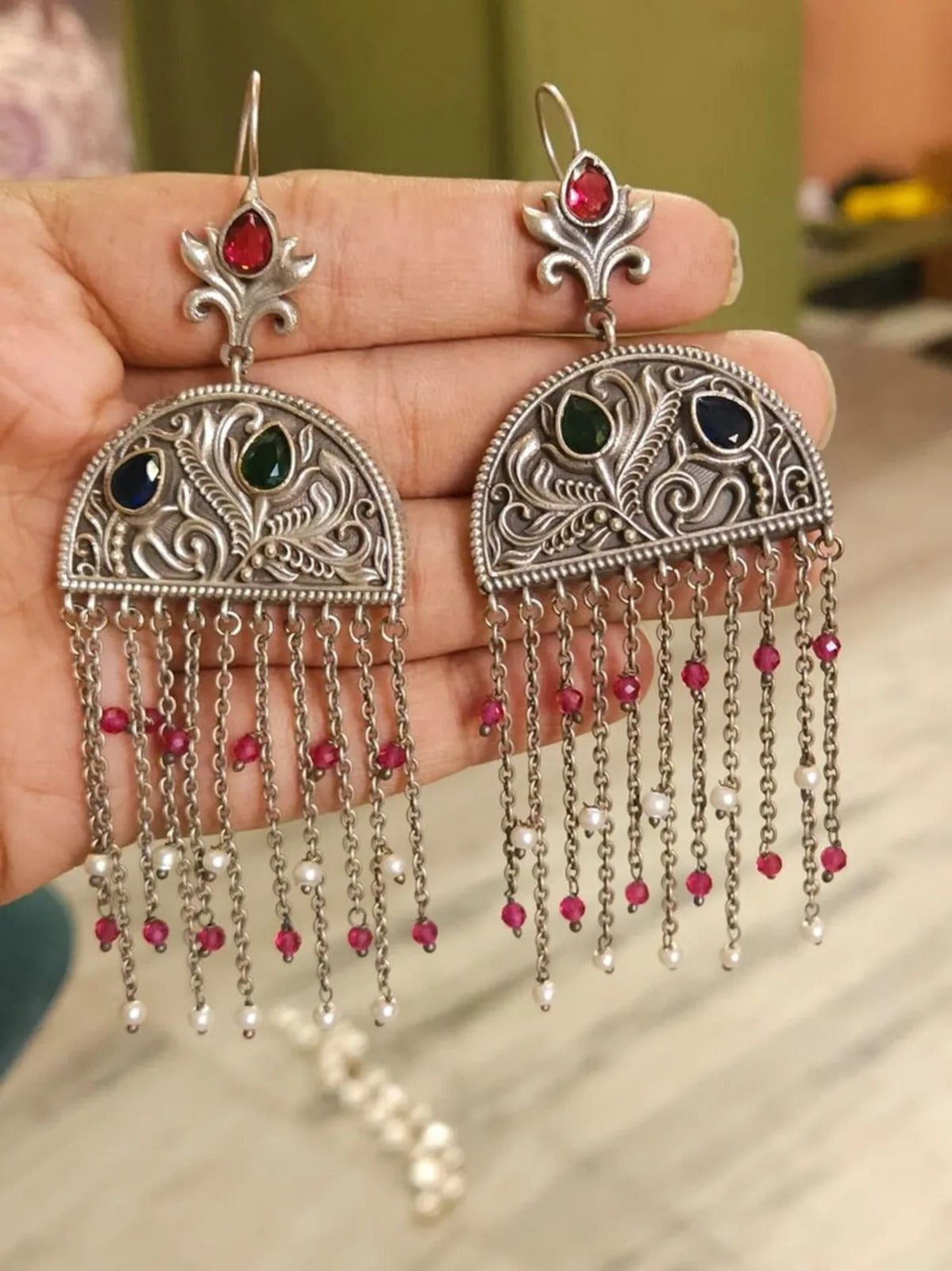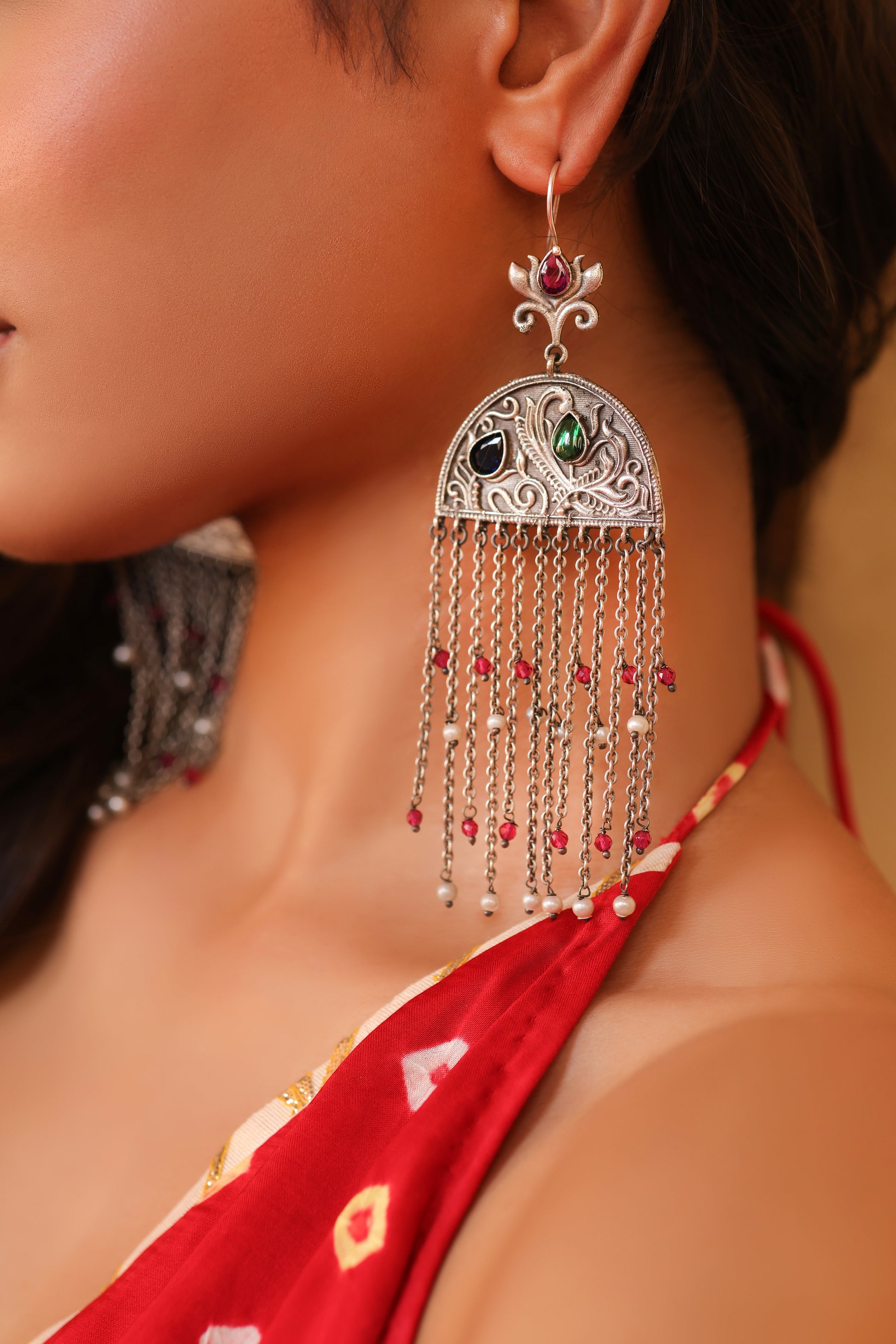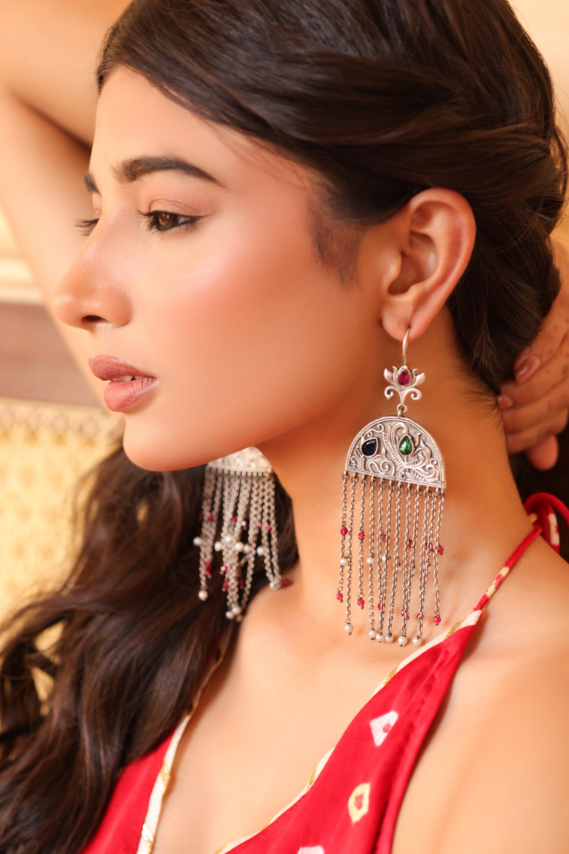 Made from high-quality brass, these earrings combine durability with a lightweight feel, ensuring comfort throughout the day. The harmonious interplay of silver tones and multicolored embellishments makes these danglers a versatile accessory, ideal for both traditional and modern outfits. Whether for festive celebrations or formal occasions, these earrings effortlessly elevate your style.